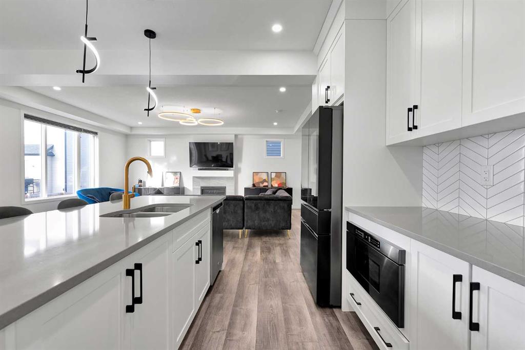 Step inside and be greeted by a bright, open-concept main floor featuring 9FT CEILINGS and VINYL PLANK FLOORING. The stunning kitchen impresses with QUARTZ COUNTERTOPS, a HERRINGBONE TILE BACKSPLASH, BLACK STAINLESS STEEL SMART FRIDGE, WALK-IN PANTRY, and a large ISLAND WITH SEATING—perfect for casual dining. The spacious living room with TRAY CEILING centers around a TILED GAS FIREPLACE WITH A MODERN MANTEL, while the adjacent dining area features PATIO DOORS TO THE DECK -ideal for BBQs and A SUNNY WEST-FACING BACKYARD.
