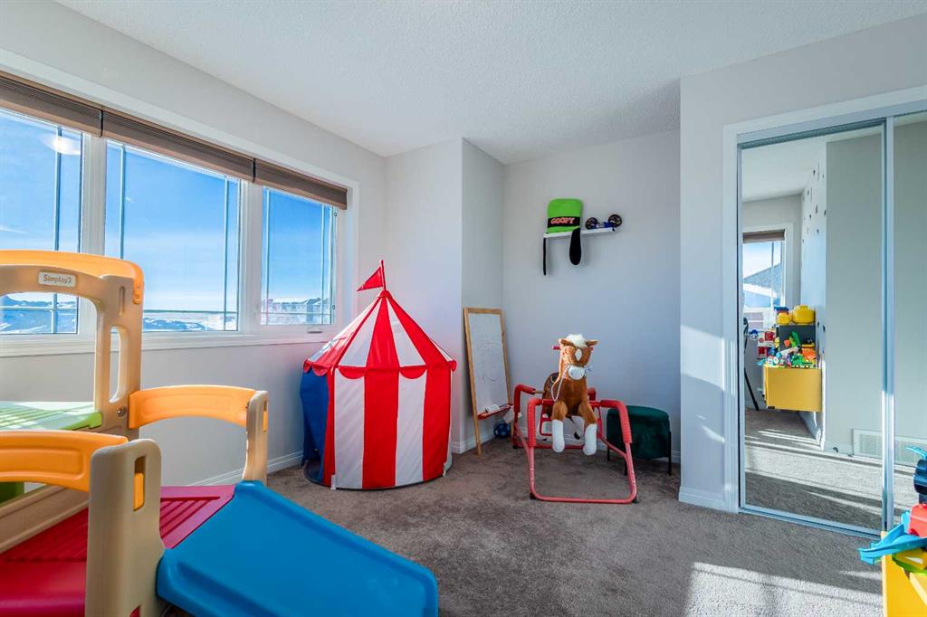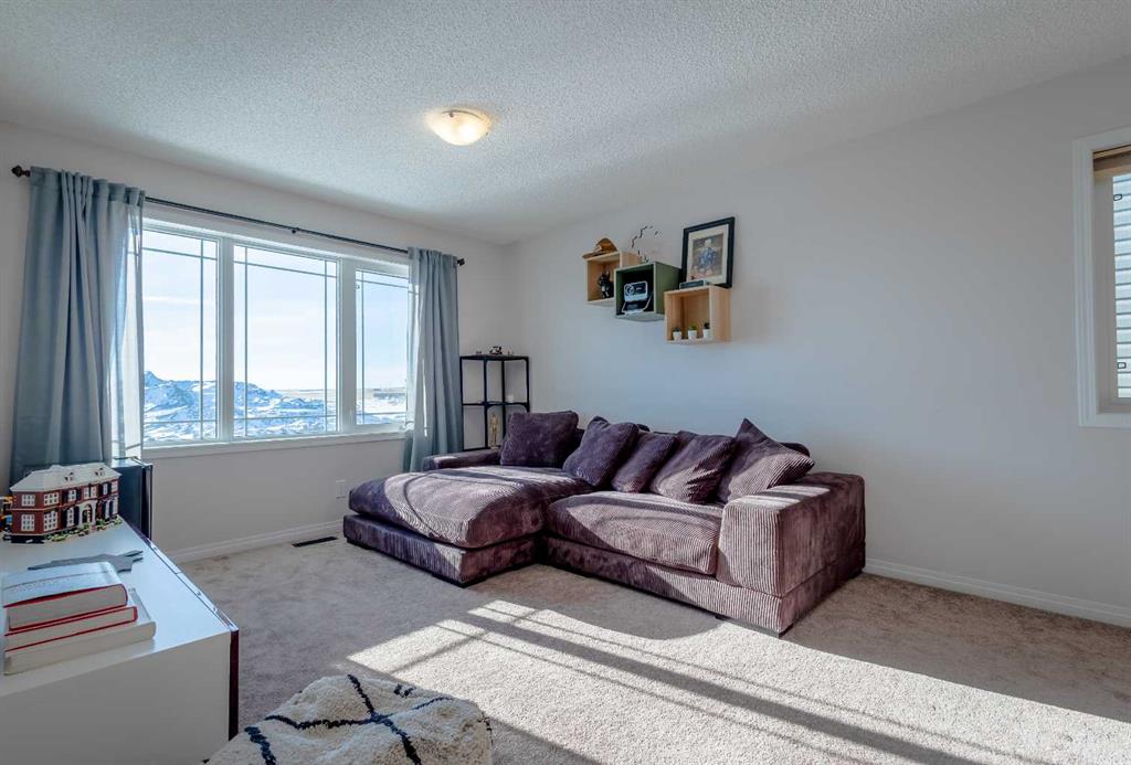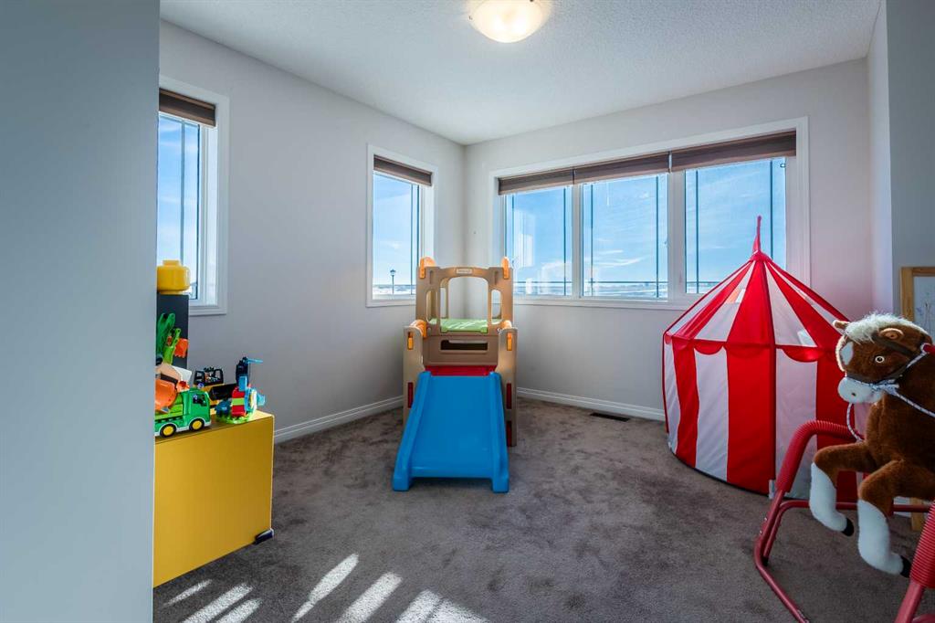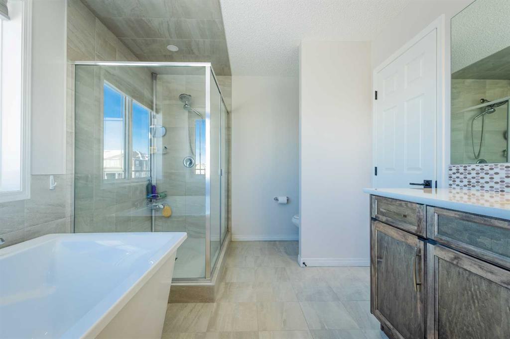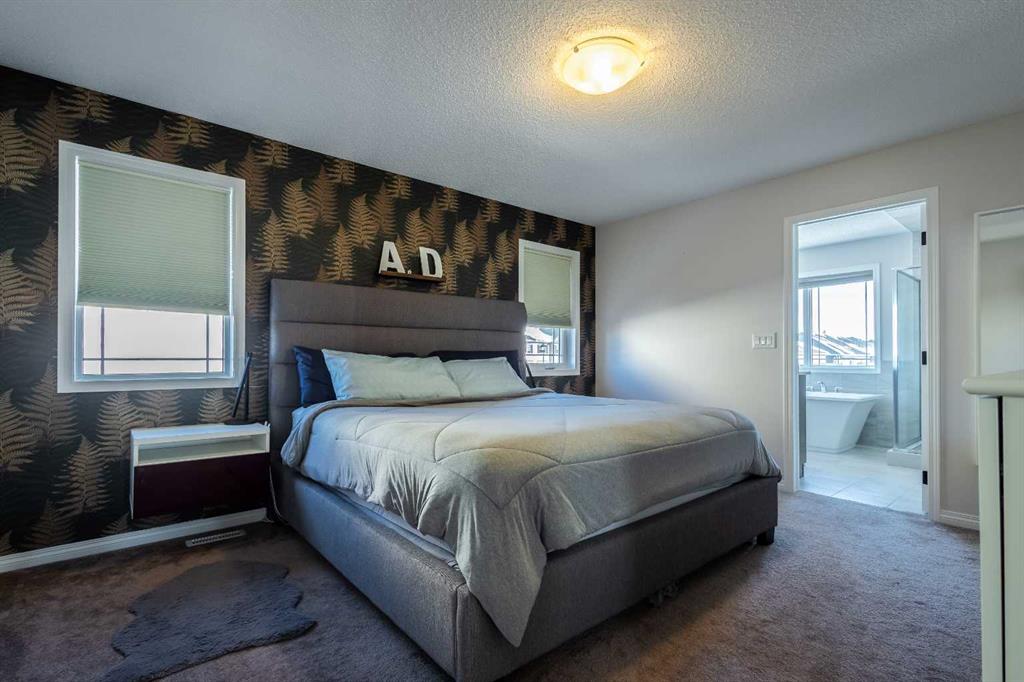Upstairs, a sun-filled bonus room is surrounded by walls of windows and accented by a wraparound wood railing, creating a bright and airy retreat. A large upper-level laundry room and linen storage enhance everyday convenience. The primary bedroom comfortably accommodates a king-sized bed and features a walk-in closet and a spa-inspired ensuite with a floating soaker tub, glass walk-in shower, and extra-tall quartz-topped vanity. Two additional generously sized bedrooms and a well-appointed main bath continue the home’s light-filled design.