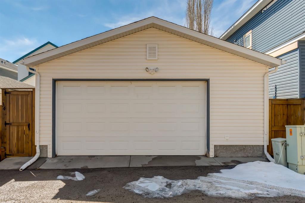 The backyard is thoughtfully landscaped and designed for both relaxation and practicality. A wooden patio offers a comfortable outdoor seating area, while poured concrete pathways provide clean lines, durability, and ease of maintenance. A detached oversized rear garage adds everyday convenience, storage, and workshop flexibility, and is complemented by a paved rear lane.