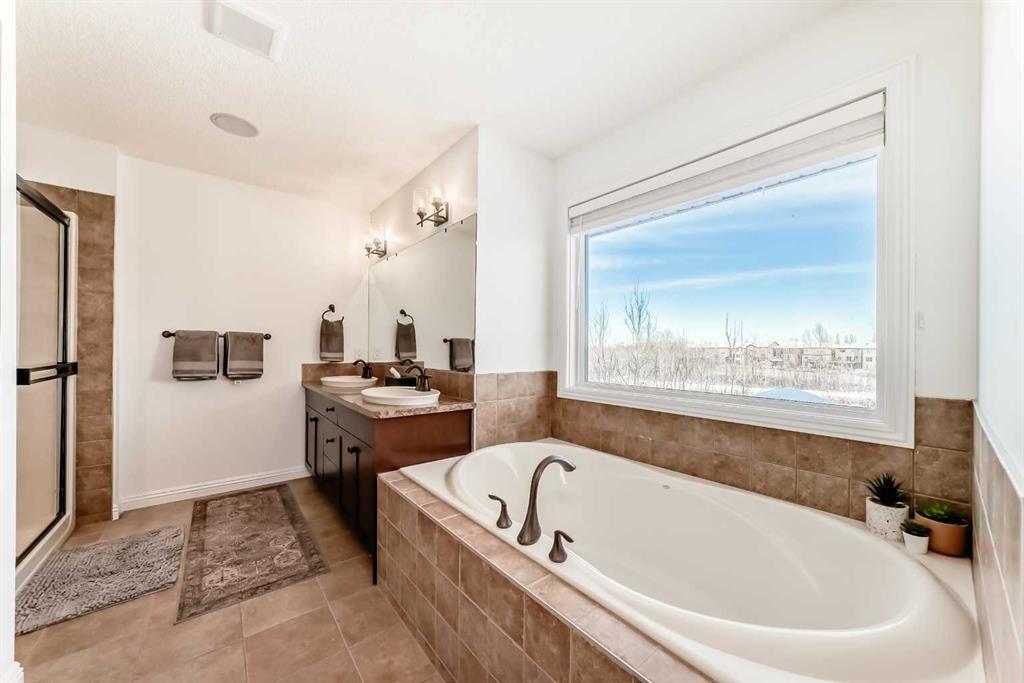 This spacious and beautifully updated 3-bedroom home offers over 3,200 sq. ft. of bright, open living space, featuring an attached garage, lake access, and a fully finished walkout basement backing onto a tranquil pond. The main and upper levels feel expansive with new plank flooring, premium carpet and underlay, fresh modern paint, upgraded LED lighting, stylish fixtures, and sleek black hardware. The generous kitchen boasts granite countertops, a large pantry, new appliances, soft-close hardware, and an upgraded island. Upstairs, the luxurious primary suite includes a 5-piece ensuite and a walk-in closet with a custom organizer, while the upper level also provides convenient laundry. Mechanical upgrades include a new 75-gallon hot water tank and water softener. The exterior extends your living area with a rebuilt upper balcony with new structure and railings, a wide lower deck, a spacious brick patio with roughed-in connections for a hot tub, a welcoming fire pit area, custom planters, improved drainage, and a new shed. An elegant move-in-ready walkout home offering abundant upgrades, generous living spaces, and serene water views.