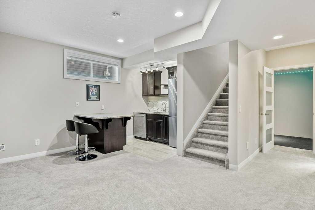 Downstairs, the professionally developed basement (with permits) offers exceptional additional living space with 9’ ceilings, dry core flooring, and a second gas fireplace. The recreation area includes a fully equipped wet bar with island, fridge, dishwasher, storage cabinetry, and tiled finishes, making it ideal for entertaining. The basement also features a 4th bedroom, a 3-piece bathroom with tiled shower and granite vanity, a workout area, and additional storage, with potential space for another bedroom. Speaker rough-ins are also installed throughout the recreation area.
