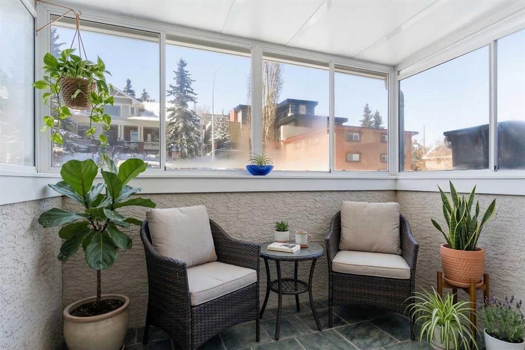 OPEN HOUSE Saturday April 11 2-4pm. Price improvement! Immaculate and EXCELLENT VALUE in this turnkey west-facing corner condo located next to Buckmaster Park in the heart of Bankview. Enjoy immediate access to one of the community’s best outdoor spaces, with the community centre, tennis courts, community gardens, and off-leash dog park just steps away. This bright and RECENTLY RENOVATED condo offers abundant natural light and a spacious secure sunroom perfect for relaxing. The updated kitchen features granite countertops, stainless steel appliances, and modern finishes. The unit has been professionally painted with brand new flooring throughout, creating a fresh, move-in ready space. The well-designed layout includes two bedrooms and a renovated bathroom with granite counters and updated tile surround. Additional highlights include in-suite laundry, an oversized parking stall, a separate storage locker, and convenient bicycle storage. Located in a quiet, pet-friendly concrete building, this condo is just a short walk to transit, shops, restaurants, and amenities, with easy access to downtown, 17th Avenue and Marda Loop. A fantastic opportunity offering exceptional value and strong investment potential in one of Calgary’s most walkable inner-city neighbourhoods.