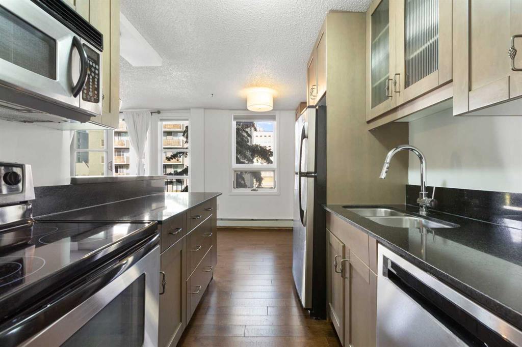 ELECTRICITY INCLUDED | STORAGE UNIT | GYM AND PARTY ROOM | WALK TO 17TH AVE | Centro 733 is a perfect location to enjoy the many nearby green spaces, walk to the bow river or pop over to trendy and vibrant 17th Ave for great food and entertainment. This 2-bedroom, 1 bathroom home offers an open floor plan featuring modern finishes such as hardwood floors, contemporary trim package, granite counter tops and stainless-steel appliances. In the kitchen you will enjoy stylish cabinetry with glass doors, an eat up bar and loads of storage for all your kitchen gadgets. The dining area allows for a dining table big enough for all your family gatherings. Both bedrooms are large enough for a queen bed. The bathroom boasts a large vanity, great for storage, a modern glass sink, tile surround in the shower with glass shower doors. This fabulous unit also comes with in suite laundry, a parking stall, gym, party room and the condo fees include electricity.