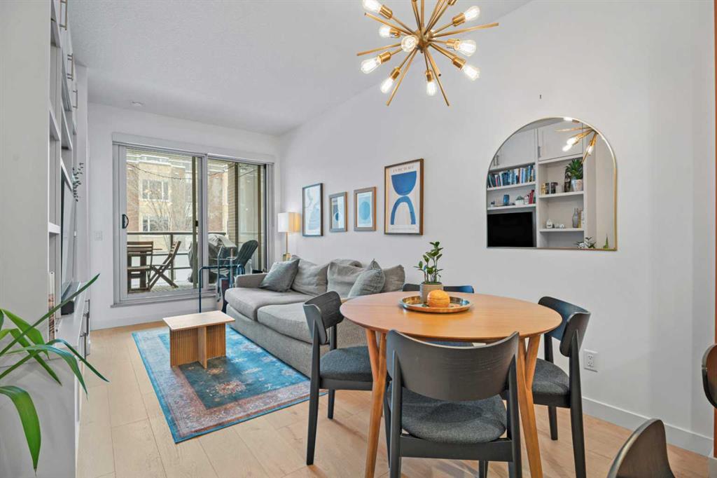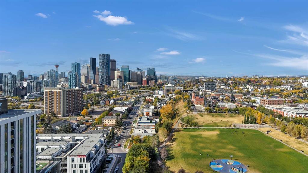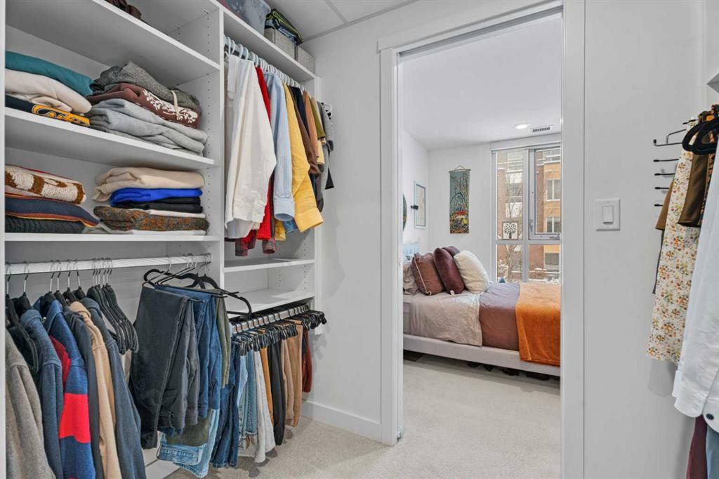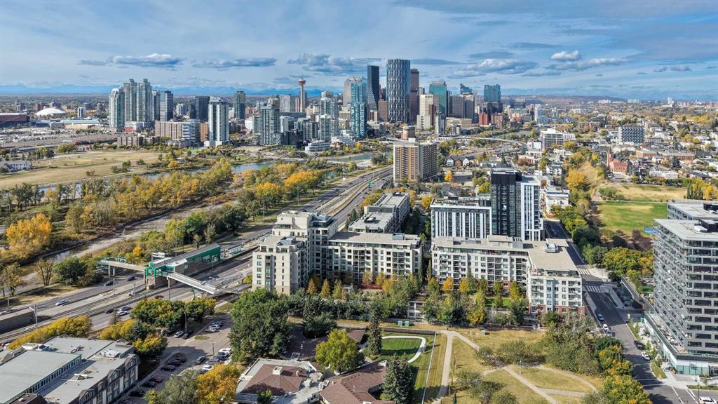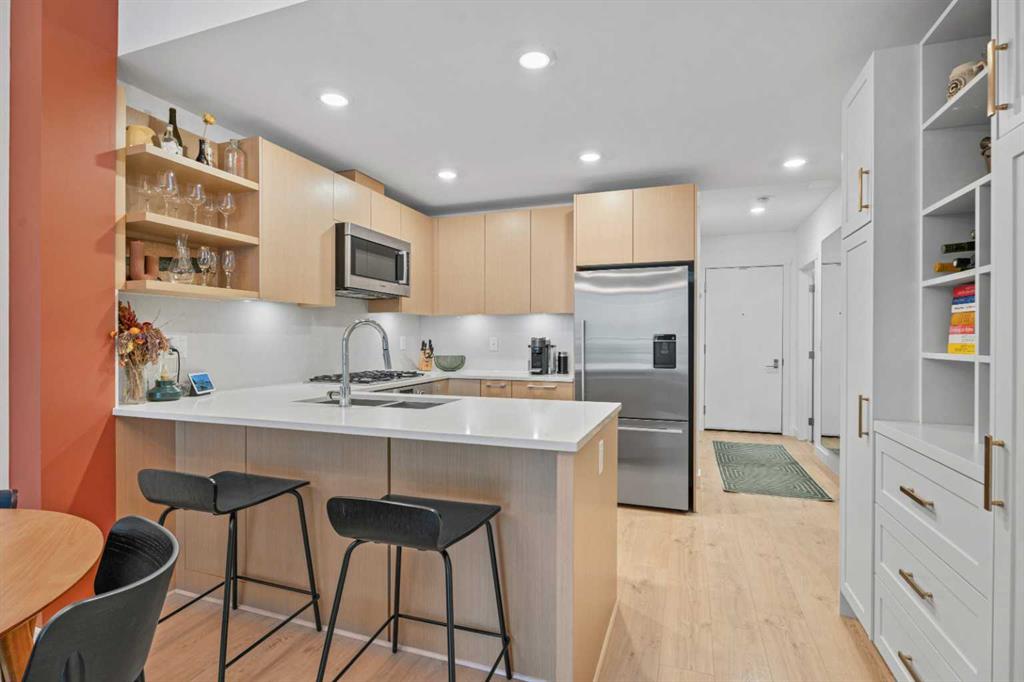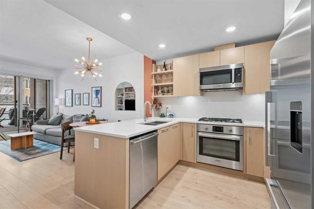 OPEN HOUSE 3-5pm SUNDAY April 19 - Welcome to Radius, an amenity-rich building offering something for every lifestyle, located in the desirable neighbourhood of Bridgeland. This spacious and extensively upgraded 2-bedroom, 2-bathroom unit features modern finishes and a bright, inviting atmosphere with a soft contemporary design. The well-appointed kitchen includes a built-in oven, gas range, ample counter space, and quality appliances, flowing seamlessly into the open-concept dining and living area complete with beautiful custom built-ins for storage and media. The generously sized primary bedroom offers a walk-in closet with California Closets organizers and a stylish ensuite with automatic floor lighting, a large vanity, and a walk-in shower. The versatile second bedroom is equipped with built-in storage and a Murphy bed with integrated desk attachments, making it ideal for guests or a functional home office. Additional highlights include a rare oversized in-suite storage and laundry room, along with a well-appointed 4-piece main bathroom. Residents enjoy access to exceptional building amenities including concierge and the main gym (1st floor), delivery room (2nd floor), secondary gym (3rd floor), yoga/barre room (4th floor), spin room (5th floor), rooftop patio and gardens with stunning city views (7th floor), dog wash station and bike storage (P1). This unit also comes with titled underground parking, and a dedicated storage room, offering convenience and comfort in one of Calgary’s most vibrant communities.