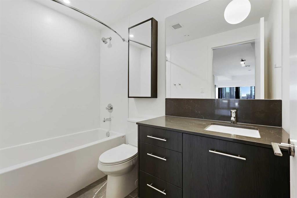 Welcome to unit 1103 at First & Park, an elegant new address in Calgary’s sought-after Eau Claire community. This one bedroom, one bathroom home combines modern design with everyday convenience. The open-concept layout features a sleek kitchen with contemporary cabinetry, quartz countertops, and premium appliances, flowing seamlessly into the bright living space and east facing balcony with. beautiful views! This unit has a full bath, and in-suite laundry offer comfort and functionality. Enjoy a titled parking stall, along with building amenities including an upscale gym & yoga studio (patio just outside which also features gas bbq hookups), party lounge, modern co-working space and concierge. Just steps from the Bow River pathways, Prince’s Island Park, dining, and downtown, this is the perfect balance of style and location. Whether you’re a first-time buyer, investor, or looking for a stylish downtown retreat, this home at First & Park is the perfect opportunity to live where the city meets the river. 1 titled parking stall with unit!