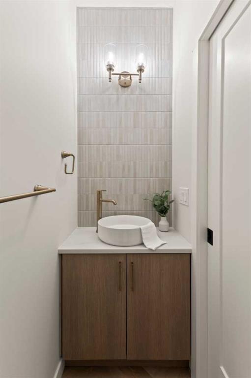 Step inside to a spacious main floor where a generous living room welcomes you with striking herringbone flooring flowing throughout and a beautifully tiled fireplace that creates a warm, inviting focal point. The designer kitchen is built for both everyday living and entertaining, featuring a large statement island, built-in oven and microwave, gas cooktop, and a pantry for seamless storage. The adjacent dining area offers the perfect setting for hosting dinners or relaxed family meals, while the stylish powder room delivers a boutique-hotel inspired feel for guests. A functional mudroom is tucked away at the rear, offering a separate entrance to the backyard and detached garage.