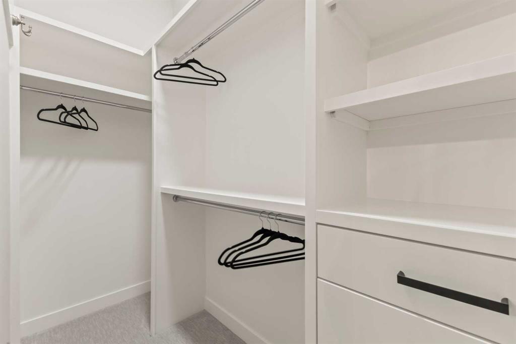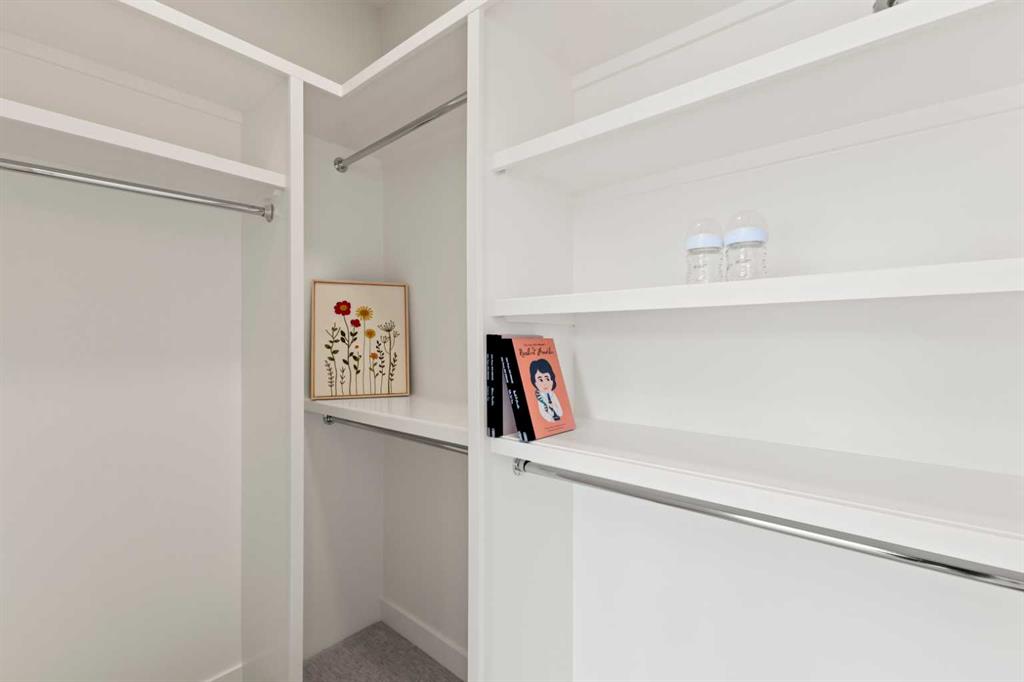 Occupying the entire third floor, the grand primary retreat is a true sanctuary. Enjoy vaulted ceilings, elegant wall sconces, and a statement hanging chandelier above the bed, along with direct access to a private balcony perfect for morning coffee or evening relaxation. The spa-inspired ensuite features a dual vanity, stunning tile work, and a glass-enclosed shower, while the walk-in closet is finished with custom shelving and built-in cabinetry.