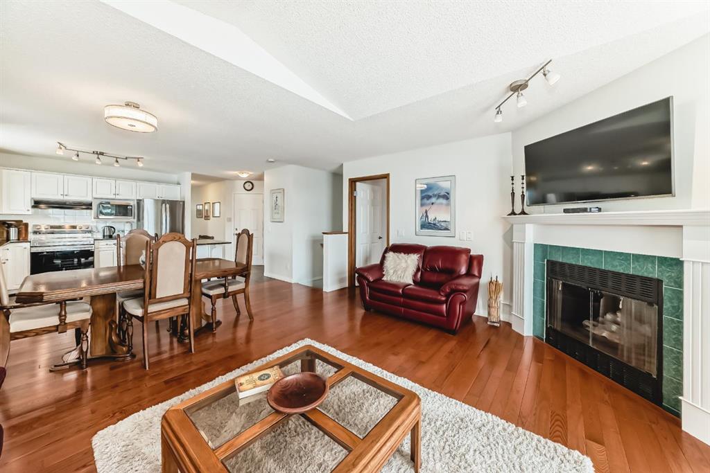 A rare opportunity to own in this well-maintained, friendly complex in Hawkwood. This beautiful two-bedroom walkout bungalow is a corner unit that features a flood of sunlight throughout the day. The open concept main floor features a large kitchen with granite counters and stainless steel appliances. The main floor also has a large office/den, main floor laundry and massive living room with enough room for a large dining room table. A gas fireplace and balcony also highlight the main floor, along with a four-piece bath separate from the primary bedroom. The primary bedroom is large enough for a king bed and offers the privacy of a four-piece ensuite. Another very spacious family room can be found in the lower level, which has another large secondary bedroom and four-piece bath. It also features a gas fireplace and private patio. While there is plenty of storage in the two-car attached garage, this home also has a very generous storage room in the lower level, with an an extra refrigerator for overflow items. The current owners had a new motor installed in the furnace and replaced the hot water tank. They also had all the Poly B plumbing removed from the home.