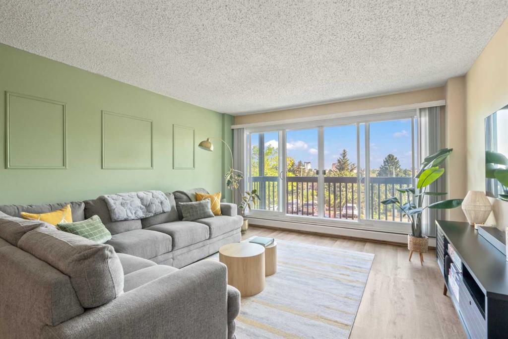 The interior showcases new luxury vinyl plank flooring and thoughtfully chosen wall accents that add warmth and character throughout. A bright living room opens through oversized sliding doors to a generous 12’ x 4’ balcony, creating a seamless indoor-outdoor flow.