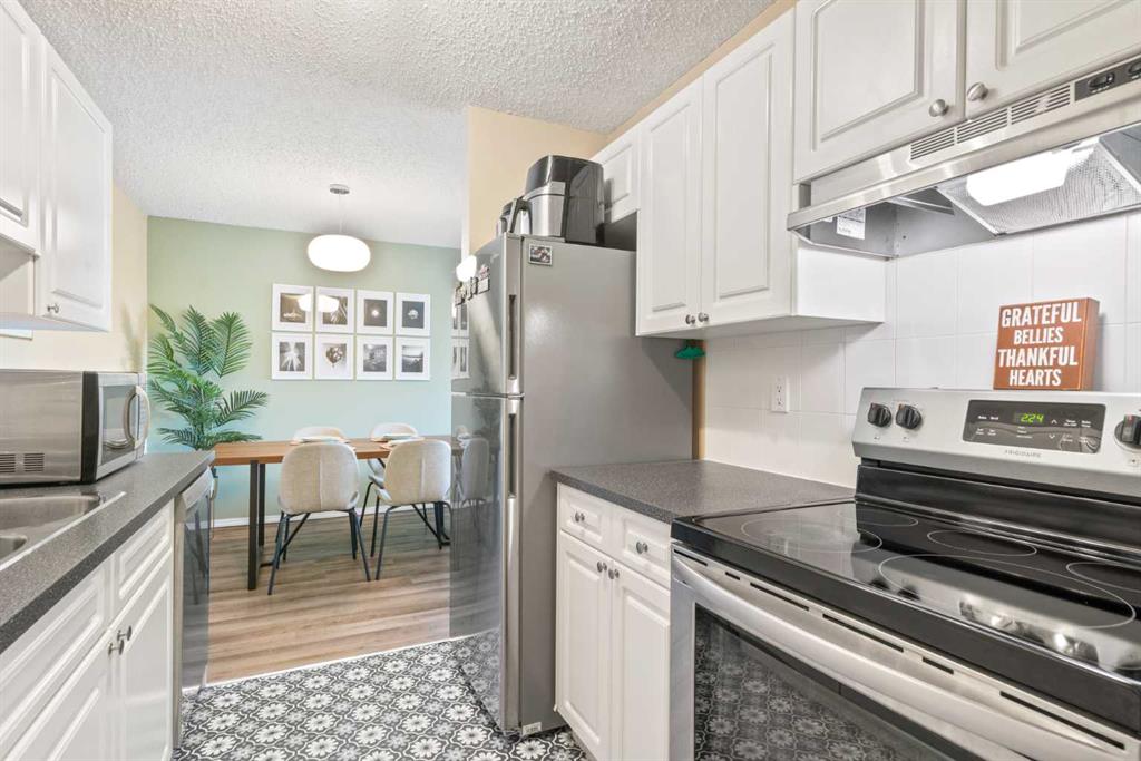 The renovated kitchen features stainless steel appliances, updated cabinetry, and a functional layout that connects to the dining area—ideal for everyday living or hosting friends. The king-sized primary bedroom provides plenty of room for a desk or reading nook, and the rare in-suite laundry brings everyday convenience.