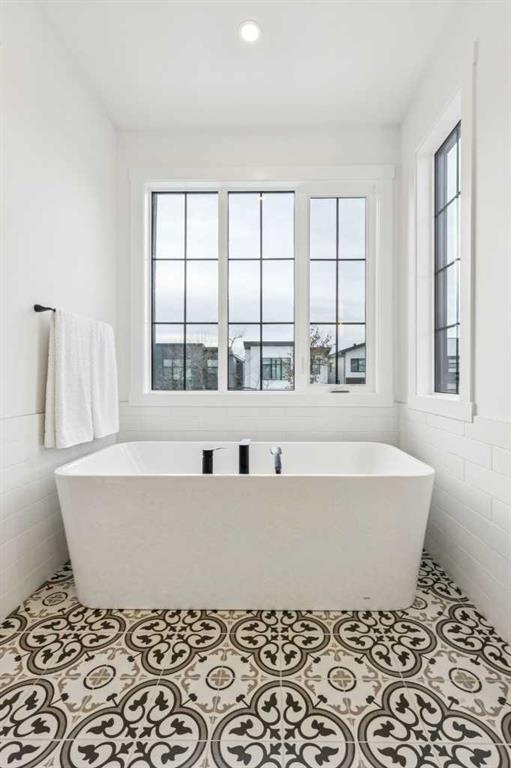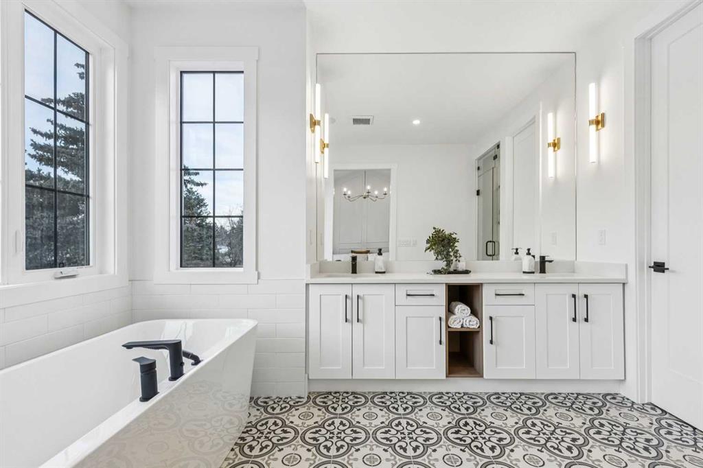 Upstairs, the primary suite is a serene retreat defined by a vaulted ceiling, abundant natural light, and a spacious walk-in closet. The spa-inspired ensuite elevates daily living with designer tilework, dual vanities, and a sculptural freestanding soaking tub. Two additional bedrooms, a beautifully appointed main bath, and a convenient upper laundry room round out this thoughtfully designed level.