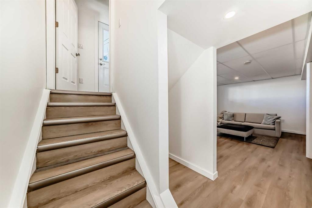 The bright, open-concept upper level features a seamless flow between the living room, dining area, and renovated galley-style kitchen. Enjoy stainless steel appliances, crisp white cabinetry, and a charming farmhouse sink. South-facing windows fill the kitchen, dining room, and main bathroom with natural light, creating a warm and inviting atmosphere. Two generously sized bedrooms, convenient upstairs laundry, and a 4-piece bathroom to complete this level.