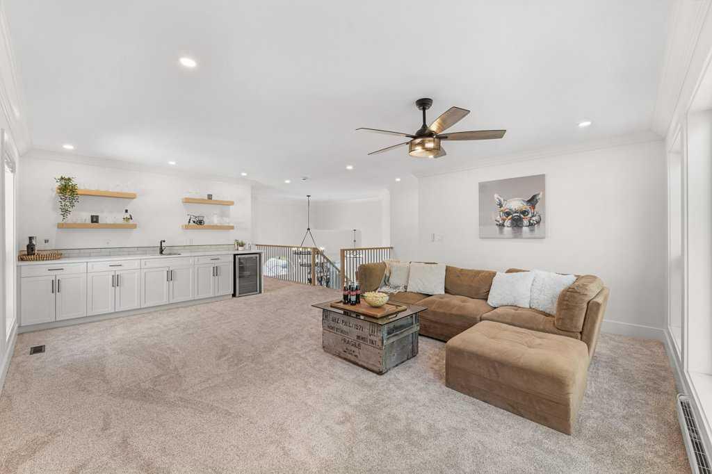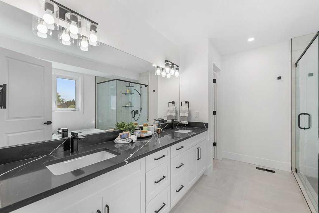 Upstairs, you'll find three generous bedrooms, including a serene and luxurious primary retreat with a spa-inspired ensuite featuring dual vanities, an oversized glass shower, and a deep soaker tub—all framed by beautiful modern tilework. The upper level also features a spacious bonus/family room complete with a wet bar, perfect for entertaining or relaxing evenings.