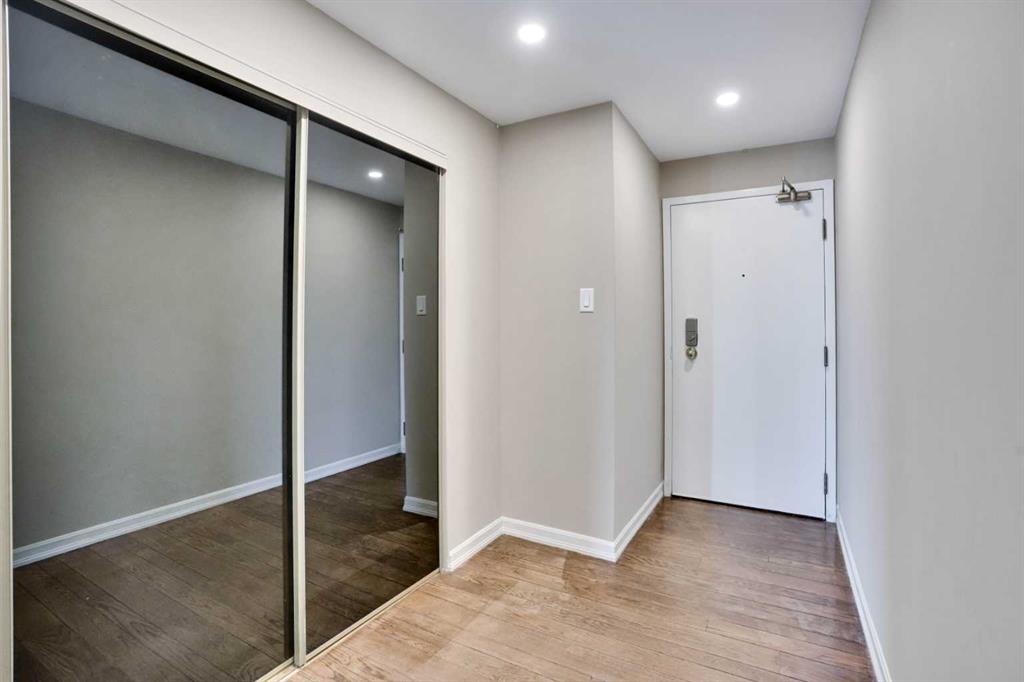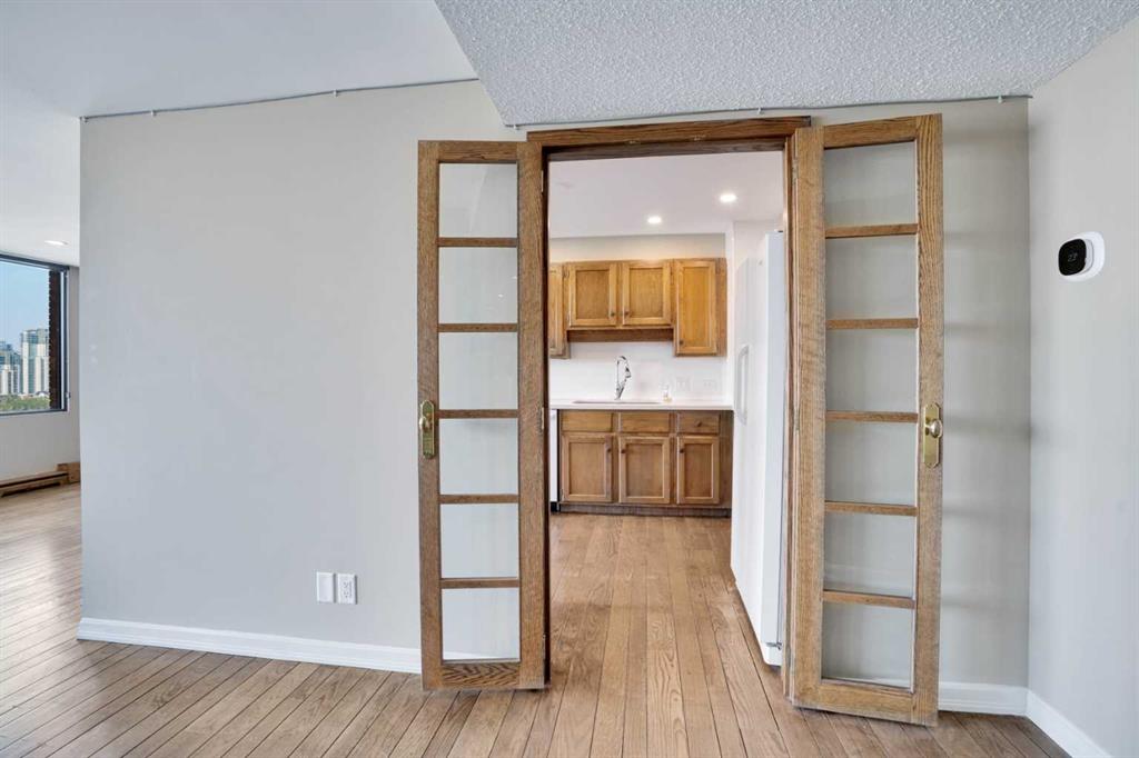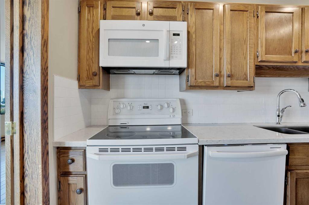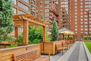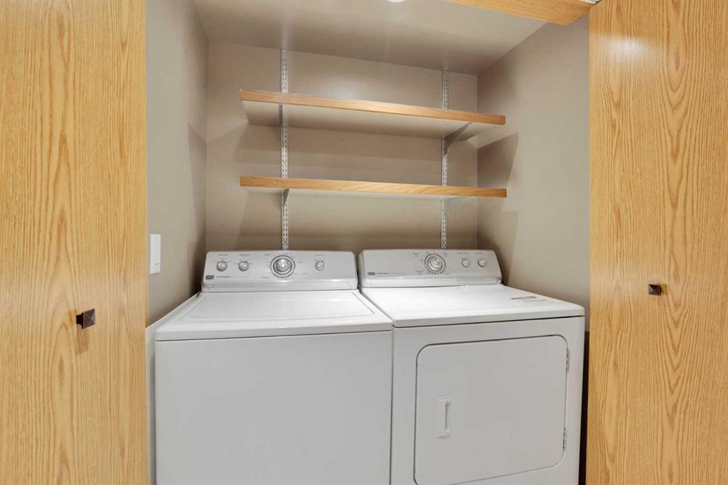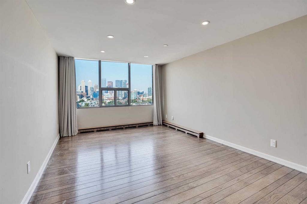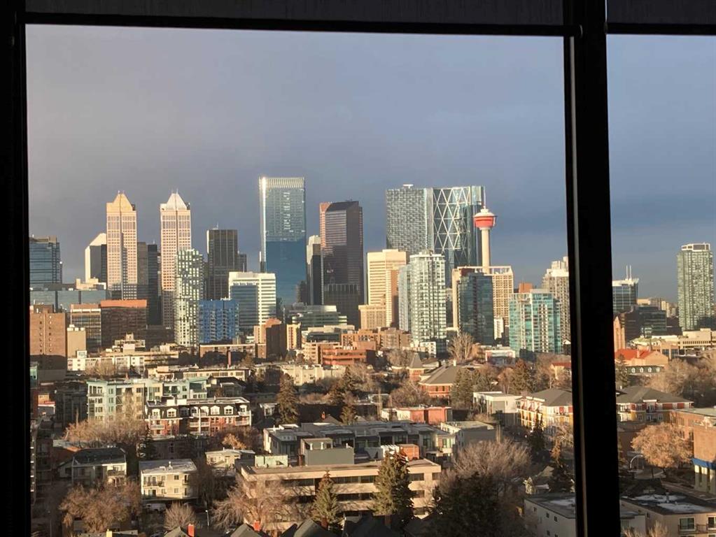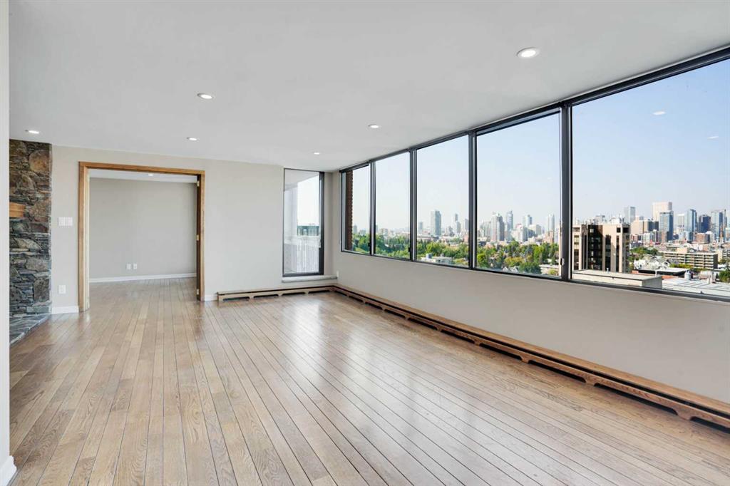 ROXBORO HOUSE sub-penthouse suite with STUNNING unobstructed city view and wood burning fireplace. Distinguished building on Elbow River and mature pathways, easy access to full complement of international restaurants and boutiques along delightfully vibrant Fourth Street. For the energetic, you can even walk downtown. Very well kept and maintained 1 bedroom plus den (den is large enough to be a second bedroom), 2 bathroom condo. The kitchen has been updated and is equipped with newer appliances and countertops. The living room boasts an incredibly beautiful stone fireplace and sides onto the dining area. Yes, it's wood-burning, a feature that will be VERY cozy as the winter rolls in. The covered balcony can be accessed from the living room and offers jaw-dropping downtown views. Fireworks from the Calgary Stampede can be enjoyed from this vantage without the crowds! It's like your own personal light show. The large primary bedroom can easily accommodate a king size bed and additional furniture, and offers custom built-in closets with abundant shelving as well as a 4 piece ensuite. The den is currently being used as an office, but is spacious enough to be set up as a second bedroom. The second bathroom just down the hall has a convenient laundry area with full size washer and dryer. A large storage room has built-in shelving, and is in addition to the storage locker that is located in the basement level. Telus fibreoptics are accessed, out of the way, in the upper corner of the storage room. Oak hardwood flooring throughout this incredible condominium...just take a look at the pictures. The building amenities have recently been updated including the indoor pool, gym, and 4th floor sun deck. Roxboro House has a concierge, security, care taker and offers other great amenities such as a workshop, social room and GUEST SUITE on main floor. There is even a special room to lock up your bicycle. Underground assigned indoor parking stall round out the value in this fabulous condo. The lifestyle fees include electricity, heat, water, sewer, garbage/recycling, professional management, insurance, Realtors, please see agent remarks.