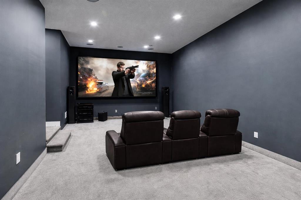 The lowest level is designed for entertainment and guests, featuring a large media and theatre room with golf simulator capability, a kitchenette or wet bar, additional bedrooms, a full bathroom, second laundry area, and integrated storage and mechanical spaces.