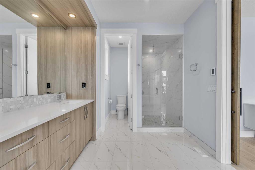 The upper level offers 9’ ceilings throughout, anchored by a luxurious primary retreat with vaulted ceilings, a beautifully appointed ensuite featuring heated floors, and a walk-in closet. Two generously sized secondary bedrooms, a full bathroom, and an upper laundry room with ample cabinetry, counter space, and a utility sink complete this level.