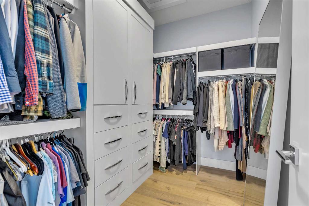 Upon entry, you’re welcomed by a spacious front formal dining area and distinctive hardwood flooring that flows throughout both the main and upper levels. The thoughtfully designed main floor showcases a striking hardwood staircase and a chef-inspired kitchen centered around an oversized quartz island with raised eating bar. The kitchen is further elevated by an extra-large, professional-grade fridge and freezer combination, offering exceptional storage and functionality for entertaining and everyday living. Additional main-floor features include ceiling speakers, a functional mudroom, a sleek modern linear fireplace with custom built-ins, and a convenient half bath.