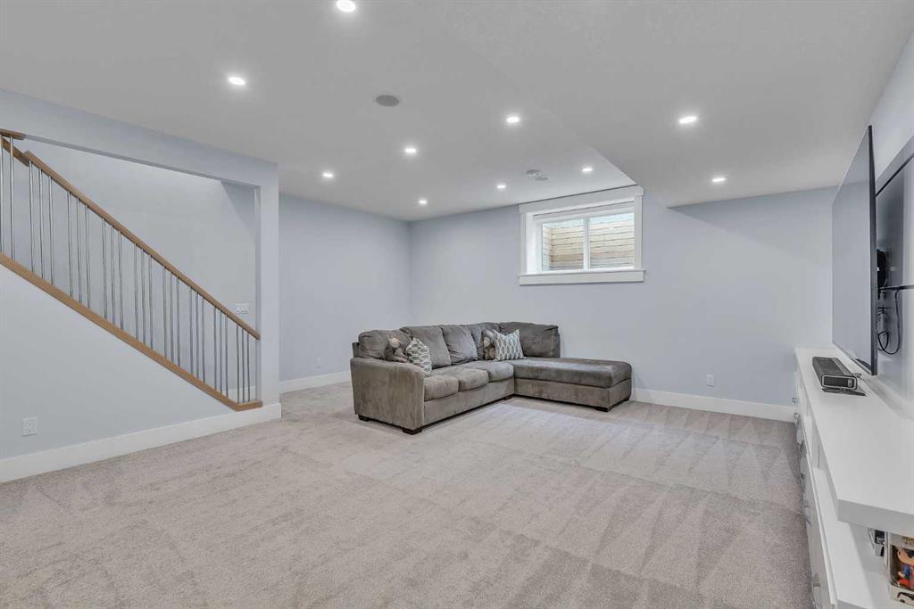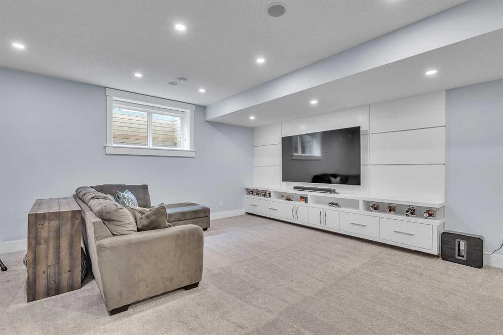 The fully developed basement is ideal for entertaining, featuring a large media room with custom built-ins, a wet bar, a fourth bedroom, and a full bathroom, along with hydronic heated floors.