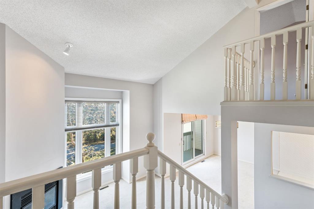 The main floor features a large kitchen with plenty of storage, opening to a spacious dining area and a large living room with a stunning vaulted ceiling that soars up to the second floor. A cozy gas fireplace and upgraded triple-paned windows on the main and upper levels fill the space with natural light while enhancing comfort and efficiency. Step onto your private balcony and enjoy the peaceful setting — this home backs directly onto a park and the community pathway system, providing privacy and a connection to the outdoors.