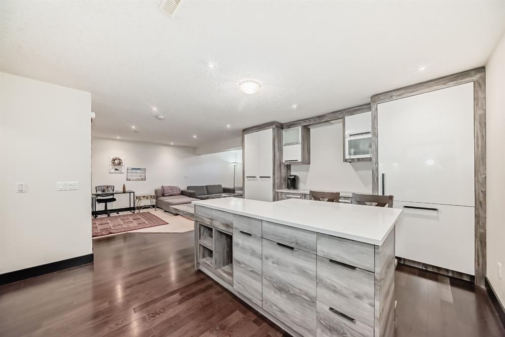 The fully finished basement with a generous bedroom, a full bathroom, electric fireplace in the living room, lit with a window, & pot lights is ready to accommodate your family or a nanny with a huge island for entertainment, surrounded by plenty of cabinetry, a sink, a fridge, and a built-in microwave! They will even have access to their own washer/dryer! There is potential for a separate entrance.