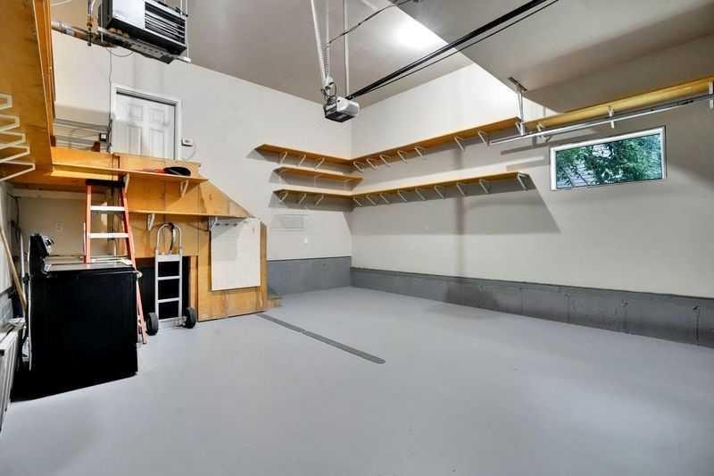The attached two-car garage (20'5" x 18'0") is equipped with a built-in heater, making it functional year-round. The freshly painted floor and walls, along with custom wooden shelving along the perimeter, keep the space organized and work-ready.
