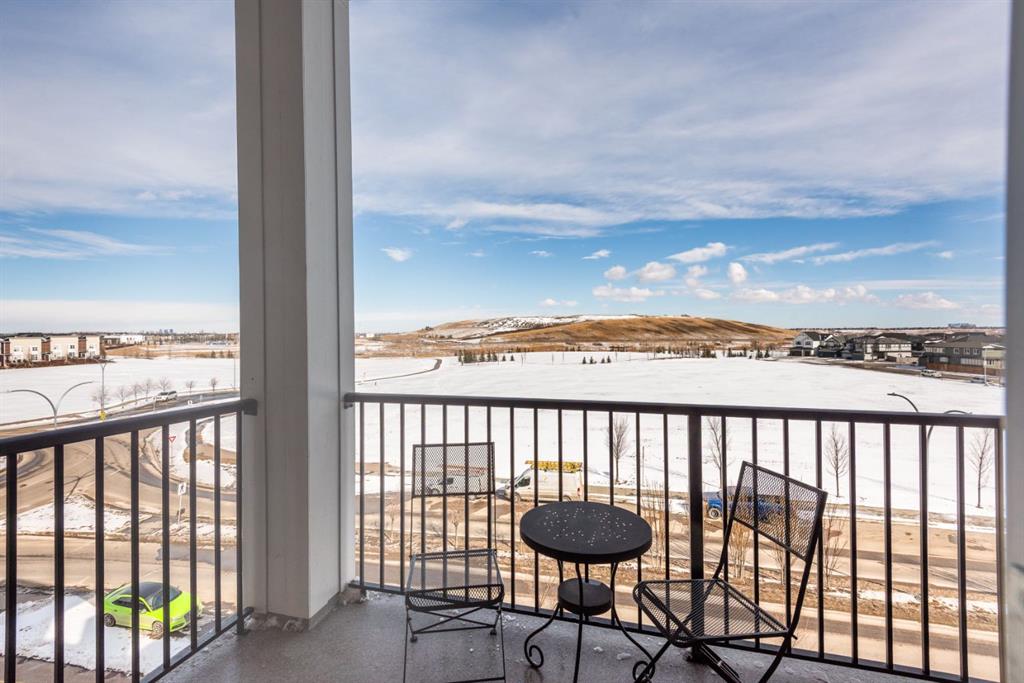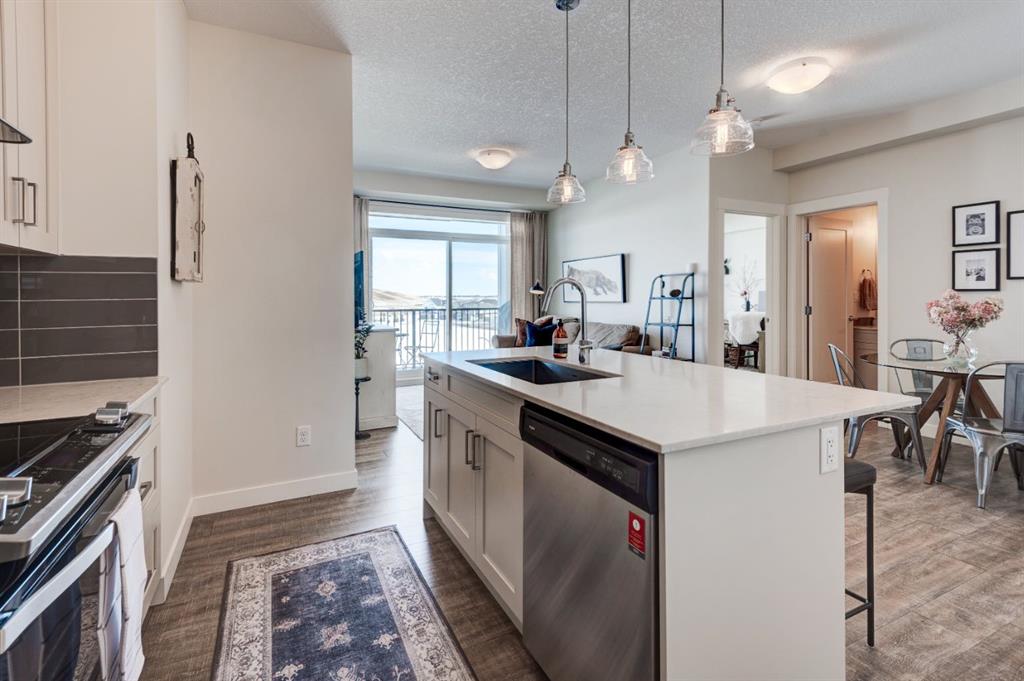 Located in the vibrant, walkable community of Walden, this beautiful top-floor 2-bedroom 763 sq.ft. apartment offers an exceptional combination of privacy, natural light, and stunning views! Enjoy unobstructed views of the park, pond, and pathways, which create a peaceful backdrop that can be appreciated from the comfort of home. As a top-floor residence with a concrete subfloor and only one shared wall, this home provides a remarkably quiet living experience rarely found in apartment living. Inside, the bright and open layout is filled with natural light from large windows throughout the living area and both bedrooms. The living area features a large sliding window with transom, perfectly framing the views while allowing sunlight to pour in throughout the day, and opens onto a spacious balcony ideal for relaxing or entertaining while enjoying the scenery. Rich, warm luxury vinyl plank flooring is complemented by painted shaker cabinetry, upgraded lighting, and approximately $15,000 in thoughtful upgrades that elevate both style and function. The kitchen is designed with everyday convenience in mind, featuring quartz countertops, a large island, built-in microwave, under-mount sink, a corner pantry, and a large French-door refrigerator. This well-designed home offers two bedrooms, including a bright primary retreat with upgraded closet organizers and a walkthrough closet leading to a private 3-piece ensuite with a wide shower. A full 4-piece main bathroom serves the second bedroom and guests. Additional convenience includes a titled underground parking stall, providing secure parking and easy year-round access. Residents enjoy a highly walkable neighbourhood with a variety of shopping and dining options just steps away, while Fish Creek Provincial Park, the Bow River, and nearby golf are just a short distance for your outdoor recreational needs. With quick access to Macleod Trail and Stoney Trail, commuting around the city is simple and efficient. This is a rare opportunity to enjoy top-floor living with stunning views, exceptional privacy, a welcoming balcony, and stylish, move-in ready finishes in this bright, quiet home.