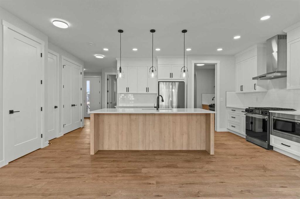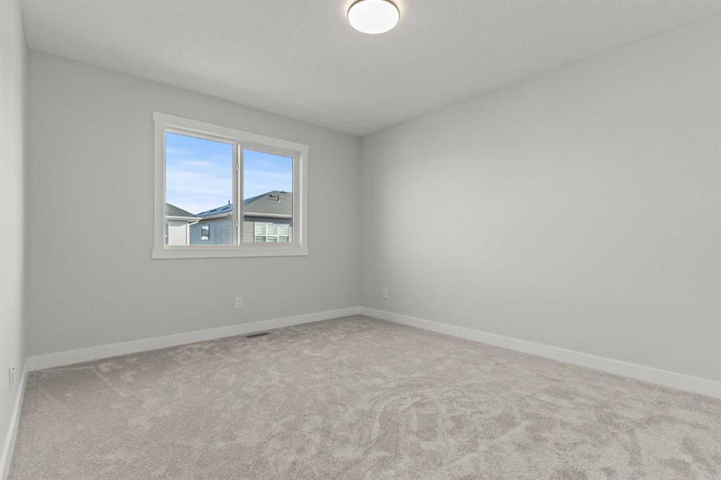 Welcome to 263 Kinniburgh Loop, a truly exceptional luxury home offering 2,457 sq. ft. of beautifully designed living space, featuring 4 bedrooms and 3 full bathrooms, thoughtfully crafted for both everyday living and entertaining. From the moment you arrive, you’re welcomed by an impressive oversized front door and a spacious, open entry that immediately sets the tone for the quality found throughout the home. Just off the foyer is a large main-floor bedroom or office, conveniently connected to a full bathroom with a standing shower—ideal for guests or multigenerational living. As you move further into the home, you’ll be captivated by the stunning chef’s kitchen featuring a nearly 9-foot island, quartz countertops, stainless steel appliances, full-height cabinetry, and high-end luxury finishes. The main floor is completed by a spacious living room with an electric fireplace, dining area, spice kitchen, and a walk-through mudroom with direct access to the garage. Everyday convenience is elevated with three main-floor closets, including two in the kitchen and one in the mudroom. Upstairs, a generous bonus room and sitting area create the perfect secondary living space. The expansive primary bedroom offers breathtaking pond views and connects to a spa-inspired 5-piece ensuite featuring dual vanities, a large glass shower with mosaic tile base, a freestanding tub, and a private toilet room. The primary flows seamlessly back into the laundry room, which also offers access back to the bonus room for added functionality. The upper level is completed by two additional large bedrooms and another beautifully finished 5-piece bathroom, with no dropped beams on the main or upper floors for a clean, open feel. This home includes all of the renowned Golden Homes standards, such as true 9-foot ceilings on the main floor, triple-pane windows, side entry, matte black iron spindle railings, matte black hardware and fixtures, built-in shelving in the pantry and primary walk-in closet, upgraded carpet underlay, a tankless hot water heater, smart home features, gas lines to both the deck and garage, and a solar panel rough-in. The exterior is fully landscaped with the lot graded and loamed, sod installed to the side entry, and a front yard tree—completing this luxury home in one of Chestermere’s most desirable communities.