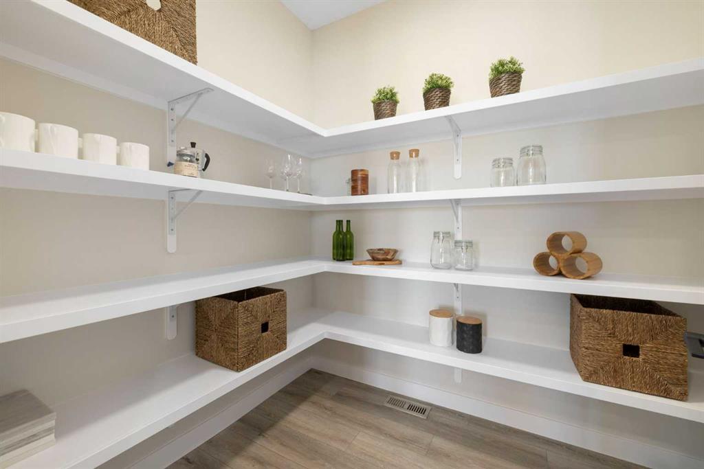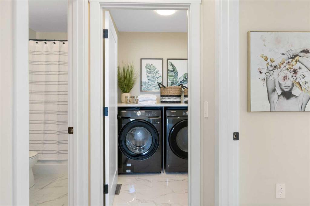 Upstairs, a grand staircase with white railings and matte black iron spindles leads to the luxurious primary bedroom, complete with a spa-like 5-piece ensuite featuring a freestanding tub, fully tiled walk-in shower, dual vanities, and an enclosed toilet. A custom walk-in closet with built-in shelving and organizers adds the finishing touch. Two additional spacious bedrooms and a full bathroom provide room for the whole family, while the tiled laundry room — complete with a quartz countertop — delivers everyday convenience.