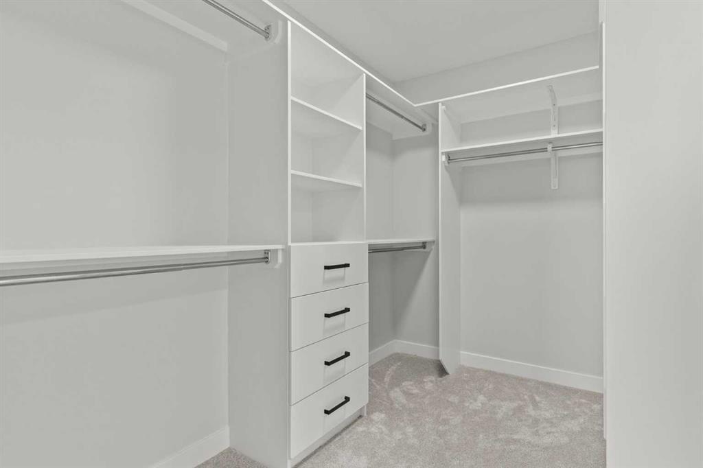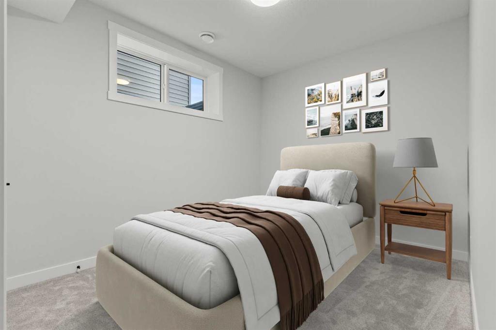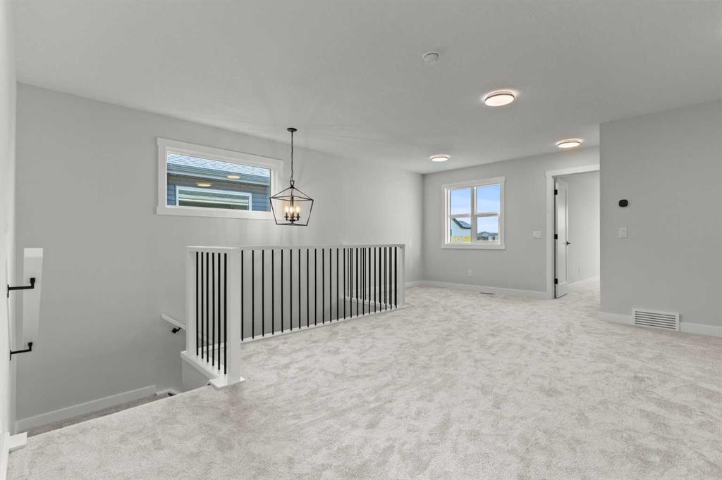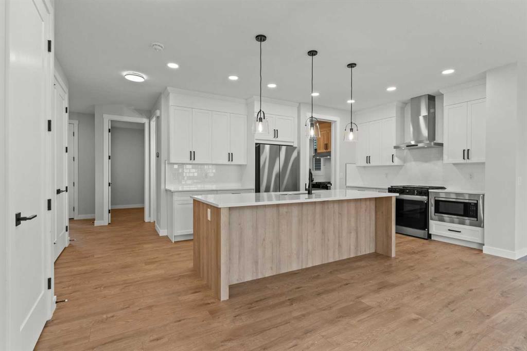 Welcome to 294 Kinniburgh Loop — a stunning 3,410 sq. ft. of finished luxury living, perfectly positioned on a walkout lot backing directly onto the pond, with breathtaking mountain views and a west-facing backyard made for afternoon and evening sun. This is one of the most coveted lots in Kinniburgh South. This exceptional home offers 6 bedrooms and 4 full bathrooms, including a main-floor bedroom with an adjoining full bathroom — ideal for guests or multigenerational living. The chef's kitchen is the heart of the home, anchored by a nearly 9-foot quartz island, full-height painted cabinetry, stainless steel appliances, and a spice kitchen for everyday cooking. The open-concept main floor flows through the living room — complete with electric fireplace — dining area, and a walk-through mudroom with garage access. No dropped beams. Clean sightlines throughout. Upstairs, a generous bonus room provides flexible living space, while the expansive primary bedroom offers a true retreat. The spa-inspired 5-piece ensuite features dual vanities, a freestanding soaker tub, glass shower with mosaic tile base, and a private toilet room — flowing directly into the laundry room and walk-in closet with built-in shelving. Two additional upper-level bedrooms share a beautifully finished 5-piece bathroom. The fully finished walkout basement adds 953 sq. ft. of premium living space with two additional bedrooms, a large wet bar with fridge, and direct walkout access to the backyard — where the pond, mountain views, and western sun await. Step outside to a full deck above and a concrete patio below, creating an outstanding outdoor living setup from top to bottom. This home is built to the Golden Standard — Golden Homes' industry-leading package of premium features included as standard in every build. From triple-pane oversized windows and true 9-foot ceilings on the main floor and basement, to a tankless hot water heater, HRV system, solar panel rough-in, smart home features, matte black hardware throughout, and premium landscaping — every detail is accounted for. A rare opportunity: walkout pond lot, mountain views, west-facing sun, and over 3,400 sq. ft. of finished space in one of Chestermere's most desirable new communities. Photos of similar model, Spec subject to change.