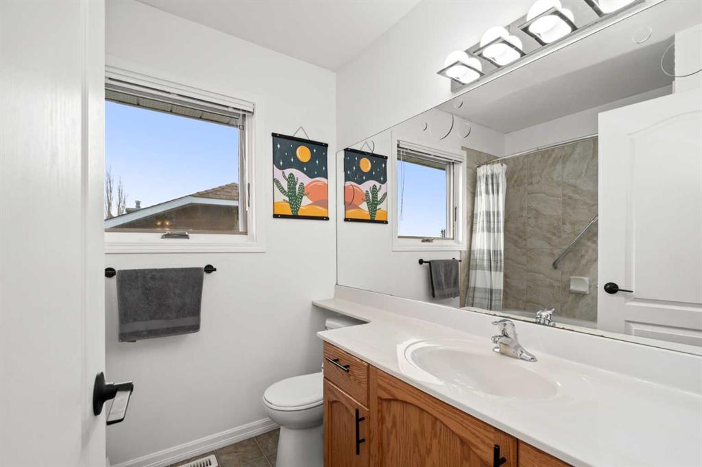 **MOTIVATED SELLER IMMEDIATE POSSESSION** Welcome to this beautifully upgraded 4-bedroom, 4-bathroom home in the highly sought-after community of Lakeside Greens in Chestermere. This thoughtfully renovated property offers comfort, function, and style with a long list of recent updates. The heart of the home is the stunning renovated kitchen (2022) featuring professionally painted cabinets, a large island with granite countertops, marble backsplash, updated hardware, and an induction stove. The main floor boasts gorgeous herringbone-patterned tile flooring with a hardwood look, a refreshed fireplace surround, new baseboards, and a custom closet in the powder room (2024). Enjoy year-round comfort with a new furnace, A/C, and thermostat installed in 2024, as well as a new hot water heater (2023). The finished basement features a fully renovated bathroom (2025), new carpet, updated flooring in the bar area, and upgraded laundry (2020). Step outside to an entertainer’s dream backyard, complete with an extended composite deck, waterproof storage underneath, a hot tub, barnboard privacy wall (2023), and beautifully landscaped gardens (2021). The exterior upgrades continue with updated front landscaping and concrete (2025) and new roof in 2013. Backing onto a walking path and playground and just a short walk to parks, schools, the beach, rec centre, and shopping, this home truly has it all!