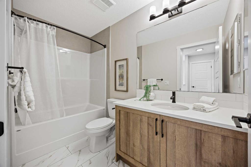 Exterior details include a Craftsman-inspired elevation with stone accents, a concrete front landing and a double parking pad out back. Fireside is a vibrant community with two schools, extensive parks and pathways, and local shops and services. It also offers quick access to the Rocky Mountains, downtown Cochrane and an easy commute into Calgary. Area size was calculated by applying the RMS to the blueprints provided by the builder. Photos are representative, colors and finishes may vary.