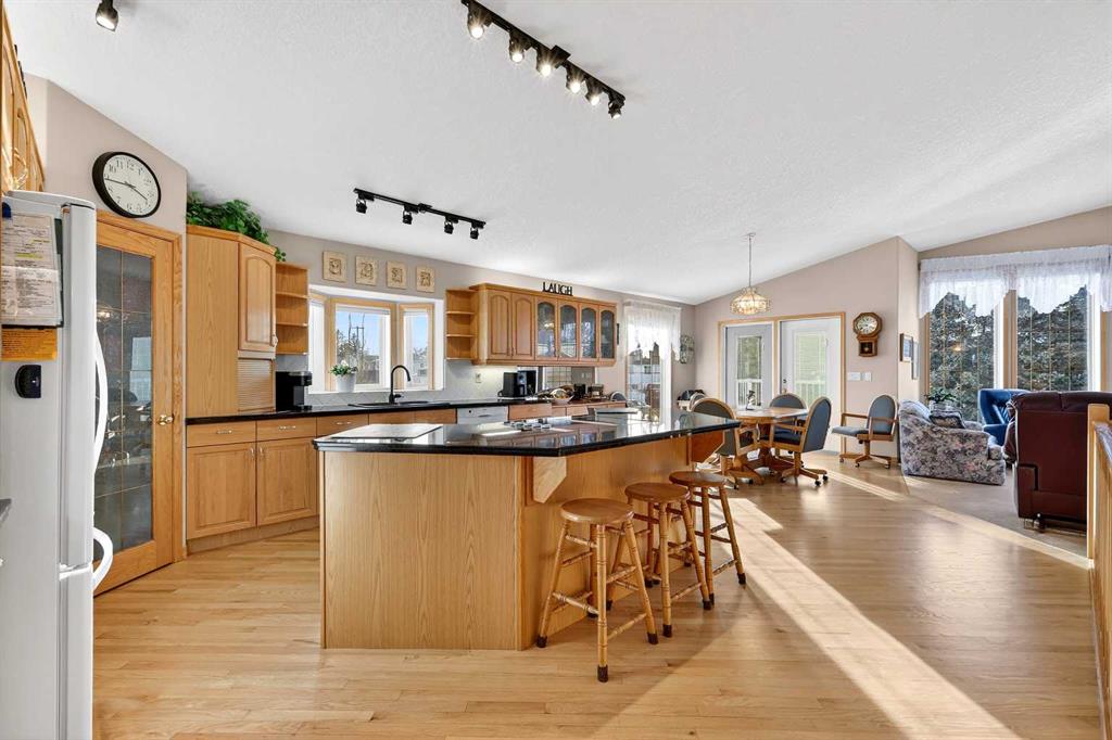 2 GARAGES - FULLY DEVELOPED WALK OUT - RV PARKING! This BUNGALOW is a contractor built personal residence that is thoughtfully designed, solidly constructed, and meticulously maintained. It is perfectly situated on large CORNER LOT in a desirable, mature neighborhood offering a total of 2983.7 sq ft of above & below grade developed living space, 2 GARAGES, RV PARKING, VAULTED CEILINGS, CENTRAL A/C, multi-zoned IN-FLOOR BOILER HEAT SYSTEM, loads of NATURAL LIGHT, abundant STORAGE, CENTRAL VACUUM, and WALK OUT basement! From the moment you step into the heated tile entrance, you are invited into a bright, open-concept floor plan characterized by soaring vaulted ceilings and an abundance of natural light. You seamlessly transition onto hardwood floors and into the gorgeous open living area that serves as the heart of the home. Here in the kitchen, you’ll find a massive granite top island with built-in cooktop, ample cabinetry, corner pantry, and full suite of appliances which then flows into the dining area designed for large family gatherings. Step out garden doors onto the tiled balcony, the perfect perch for morning coffee, evening cocktail and a GAS BBQ for summer grilling. The carpeted living room boasts floor-to-ceiling windows equipped with REMOTE-CONTROLLED BLIND SYSTEM and a GAS FIREPLACE creating the perfect spot for a cozy evening. Set to the side, the main primary retreat is equally as impressive, offering space for king-sized furniture, huge WALK-IN CLOSET, and well-appointed FOUR-PIECE ENSUITE with relaxing JETTED TUB. Completing the main level is the bright, dedicated Office at front, convenient two-piece guest bath, and main floor laundry room with 1 piece bath. There is direct access from laundry room to the double attached garage, which stays toasty year-round thanks to in-floor heating system. The lower level is a FULLY DEVELOPED WALK-OUT that feels like a natural extension of the bright upper floor. It features a massive rec/family room with custom wood entertainment center perfect for movie nights and additional space for game table or home gym. Two additional large bedrooms and a three-piece bathroom provide plenty of space for family or guests, while another versatile room offers the potential for a fourth bedroom, hobby or office space. Storage is never an issue here, with a dedicated room featuring built-in shelving and a chest freezer, with yet another storage room tucked beneath the stairs. The exterior of the property is just as impressive as you step out through garden doors onto the covered patio out to a landscaped yard, complete with mature trees and flower beds, and an underground sprinkler system to keep the grounds lush. Car enthusiasts, hobbyists, or tradesmen will be thrilled by the additional detached heated single garage with alley access, complimented by paved RV parking pad eliminating additional storage fees. MOVE-IN READY with QUICK POSSESSION available! Note: owner has the only neighboring vacant lot for sale as well.